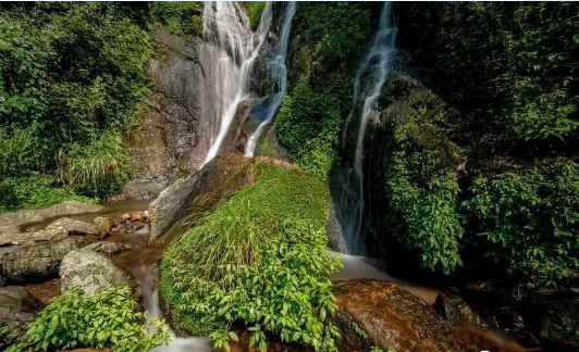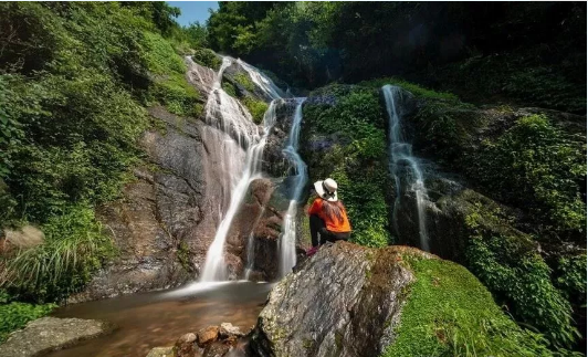 攀走二十多分钟,你会听到哗哗的声音从远处飘来,这时再往右转进去,眼前一条白练从天而降,如巨柱擎天,直插苍穹,如闪电劈空,格外醒目。仙女瀑布近在咫尺,那瀑布从山腰上冲下,溅着的水花,晶莹而多芒,像一朵朵小小的白梅,微雨似的纷纷落着。这时你得选好角度,看那飞爆撞击石块激起千万朵水花,是不是天女在散花,亦或是仙女在曼舞......