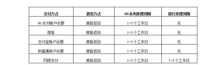 注意:退款单处理周期仅供参考,具体退款到账时间可能会受银行、支付机构、业务高峰等相关因素影响,敬请谅解。如有任何疑问您可致电GO永州客服热线18974608908,我们将竭诚为您服务。