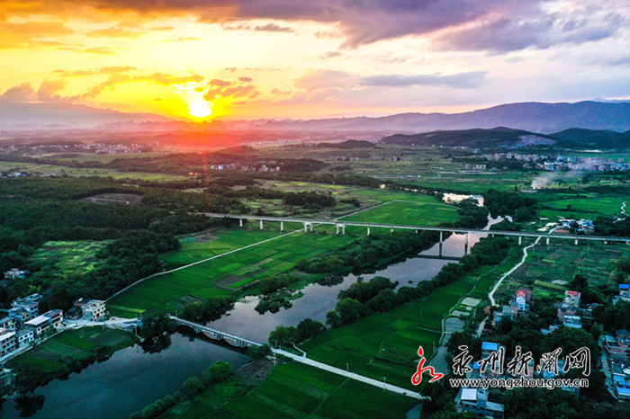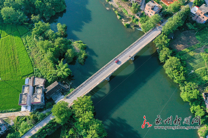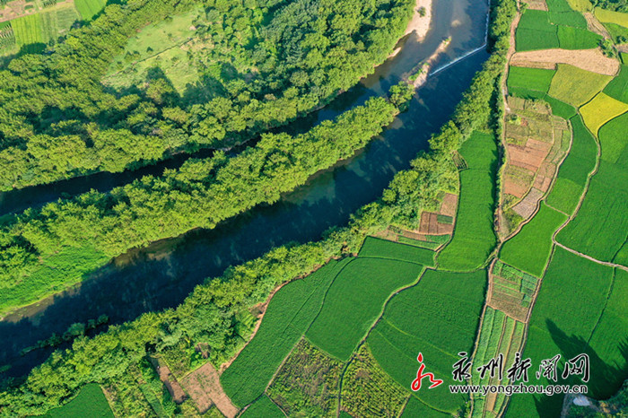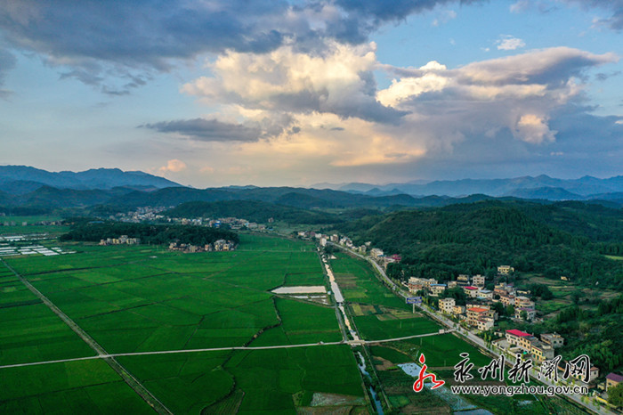 8月27日,从空中俯瞰道县梅花镇境内的乡村田园,绿油油的水稻、菜地与农村的房屋、道路、河流、山峦交织在一起,构成一幅生机盎然的田园美景。