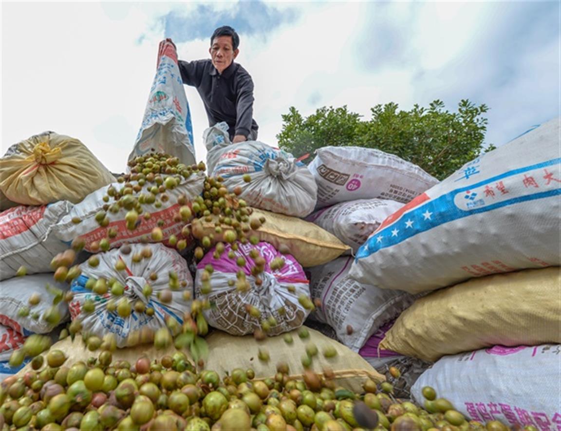 10月19日,道县白芒铺镇野竹福村森海农林油茶基地,农户正在采摘油茶籽。