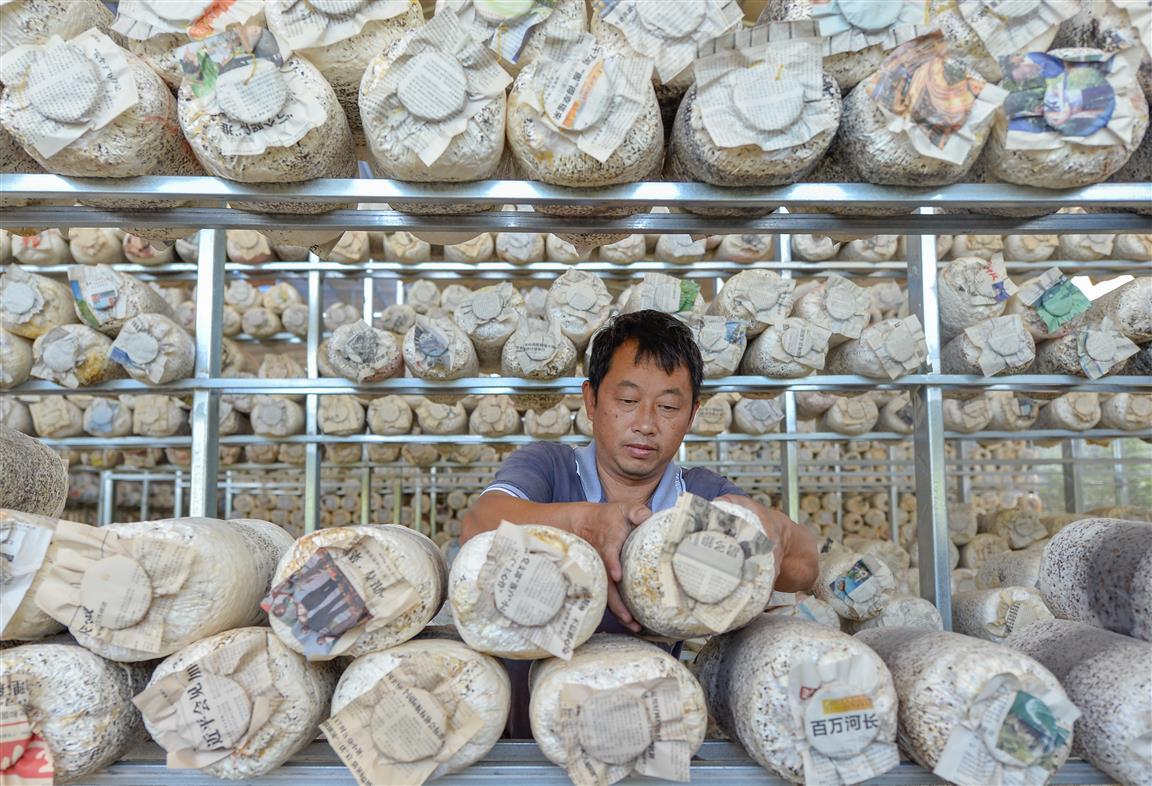今年,道县白芒铺镇马垒村通过“合作社+基地+贫困户”的模式,投资100万元,建成高标准食用菌培育大棚3个,发展种植优质大棚平菇产业,促进贫困户脱贫增收。2019年,基地预计年产平菇15万斤,年收益可达60万元。19日,马垒村食用菌种植示范基地,村民在对平菇进行管护作业。