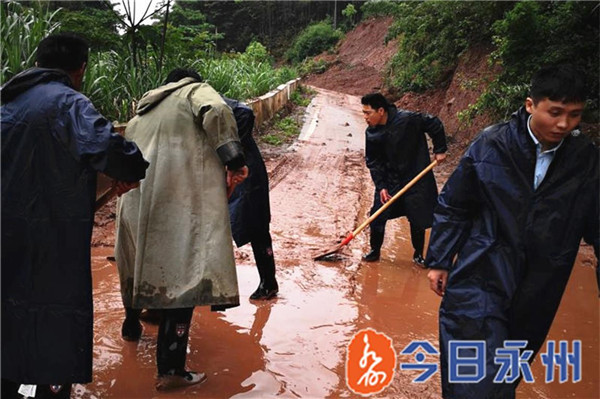 2019年5月,罗志豪(右二)带领村干部抢险救灾、疏通村主干道